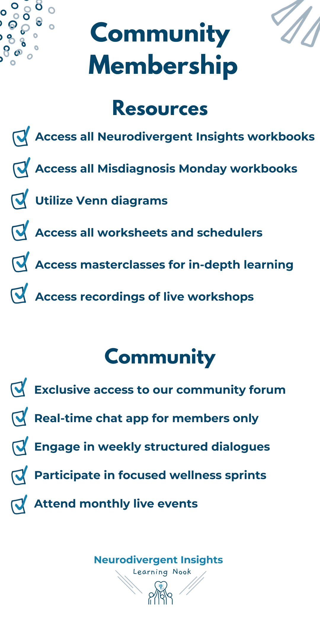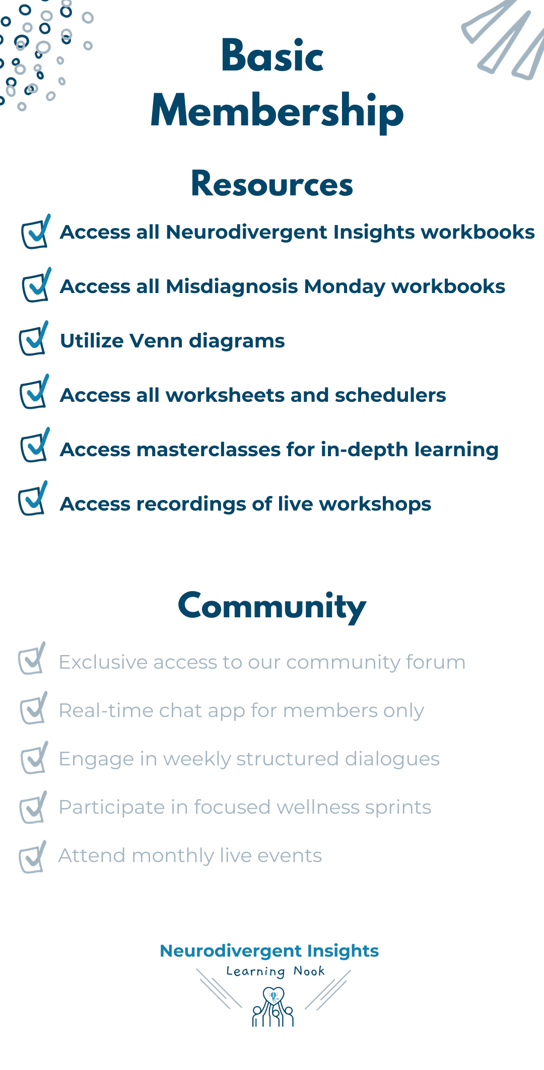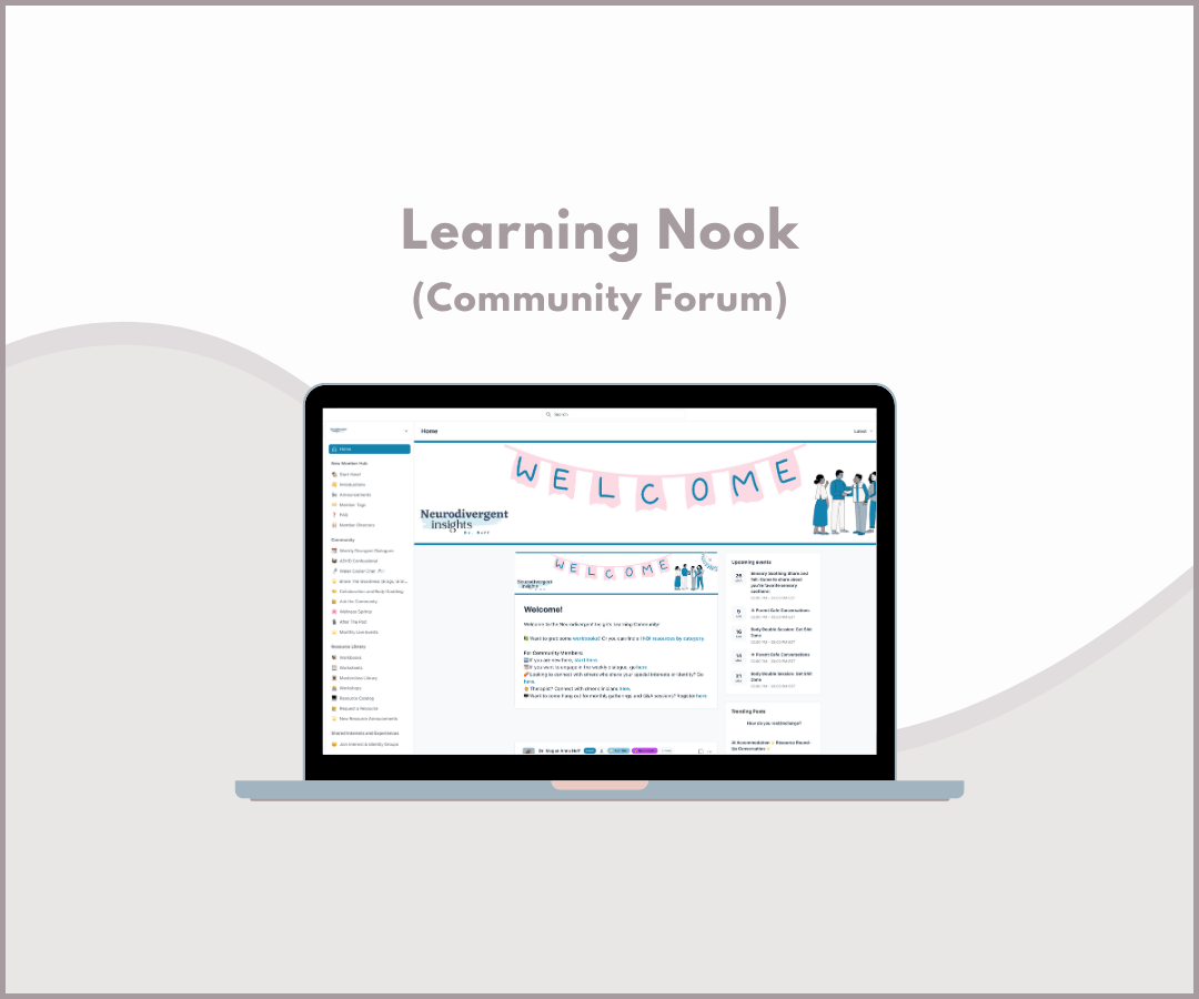 Our Basic Membership offers a great way to stay engaged while waiting for a community spot. With the Basic Membership, you'll have access to everything The Learning Nook offers, except for the community and live events. This includes all Neurodivergent Insights workbooks, masterclasses, and access to recordings of our live workshops.