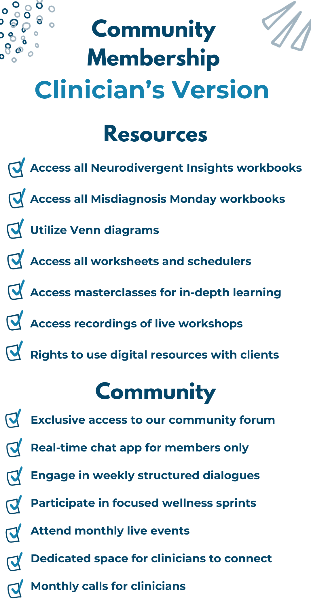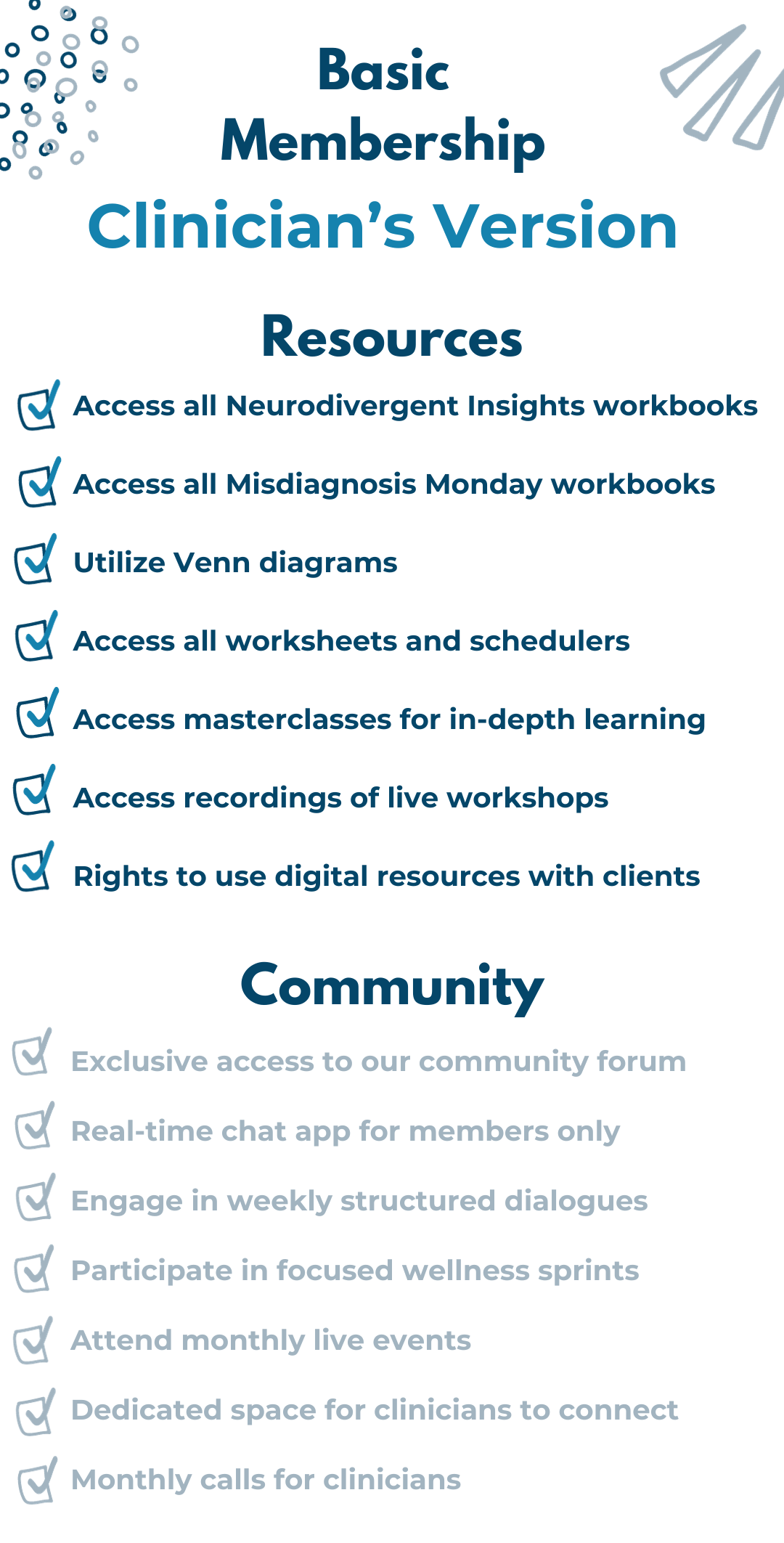 The clinical membership is tailored for medical providers, therapists, and coaches. When you opt for this membership, you not only unlock access to the entire community, including the neurodivergent adult community, but you also gain entry to a dedicated space for clinicians. This membership includes monthly calls and grants you usage rights to utilize the neurodivergent insights workbooks with your clients, enhancing your professional practice.